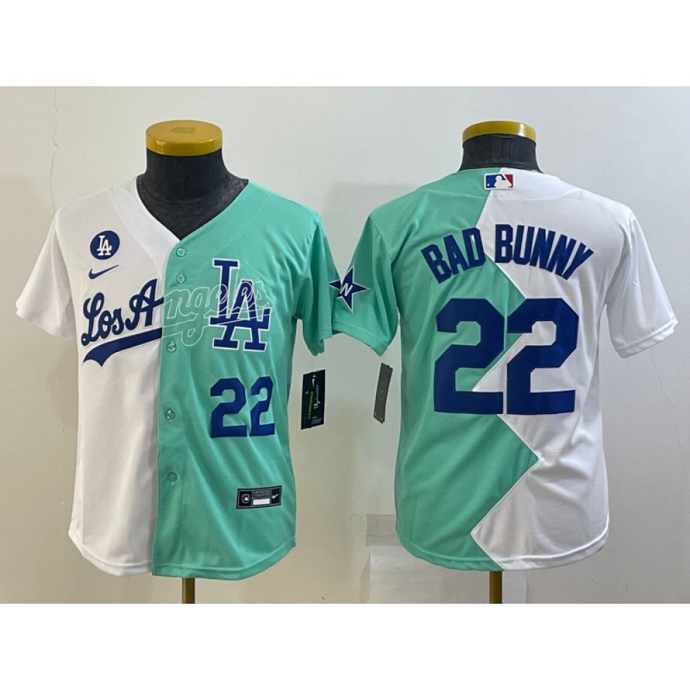 Youth Los Angeles Dodgers #22 Bad Bunny 2022 All-Star White/Green Split Stitched Jersey